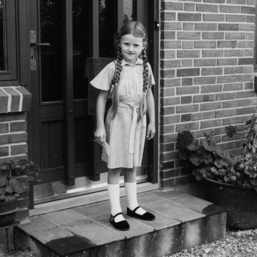 “Det er 1982 og foran Vejerslev skole stå en meget ung og nervøs spændt udgave af Dorte. Der er forinden taget fotos foran barndomshjemmet med skoletasken på ryggen. Der smiler jeg meget mere. Den røde og grønne skoletaske var nøje udvalgt og købt i sommerferien og prøvet adskillige gange siden da – jeg havde nemlig glædet mig meget til at starte og skoletiden var skøn for mig! Da vi første dag fik skemaet (der var sponsoreret af Arla) var jeg solgt – de små firkanter hver dag, med klistermærker vi satte på, viste hvordan dagen skulle afvikles – jeg ELSKEDE den struktur!”